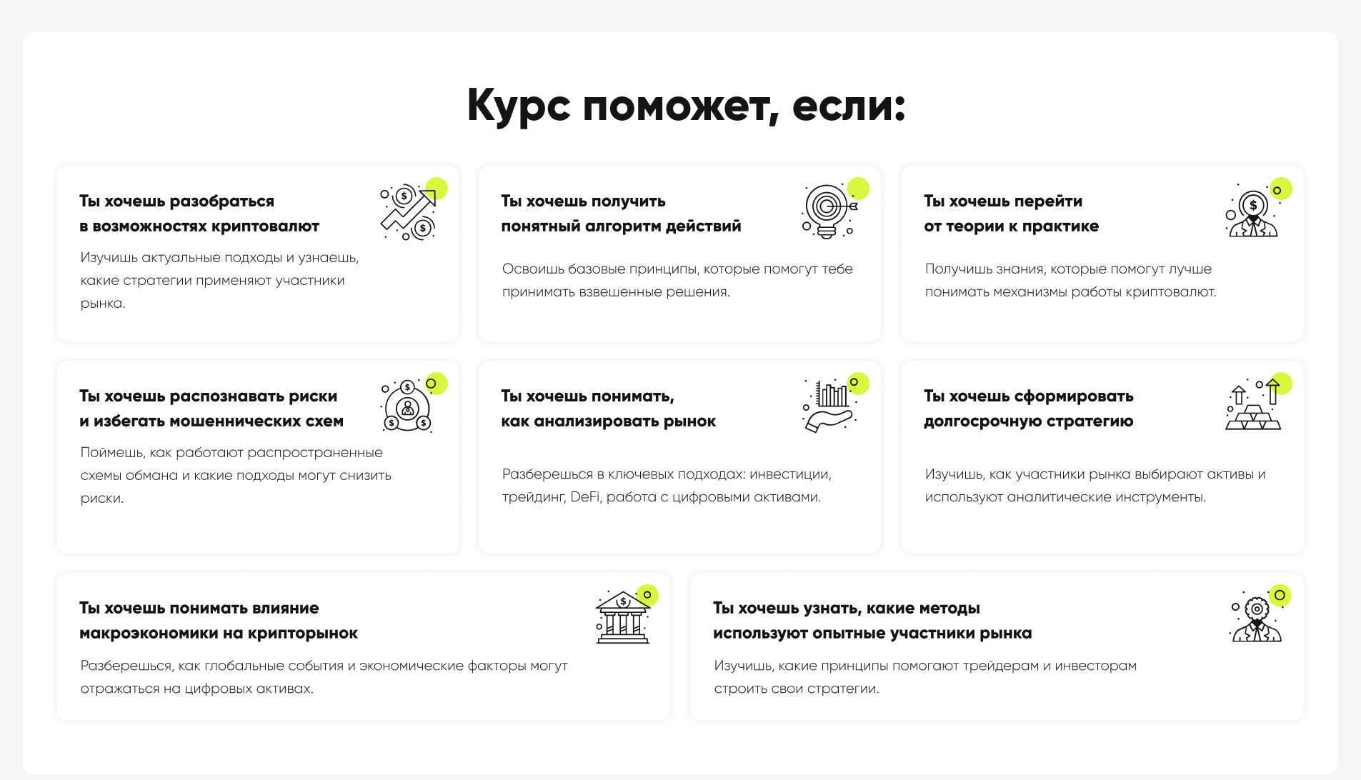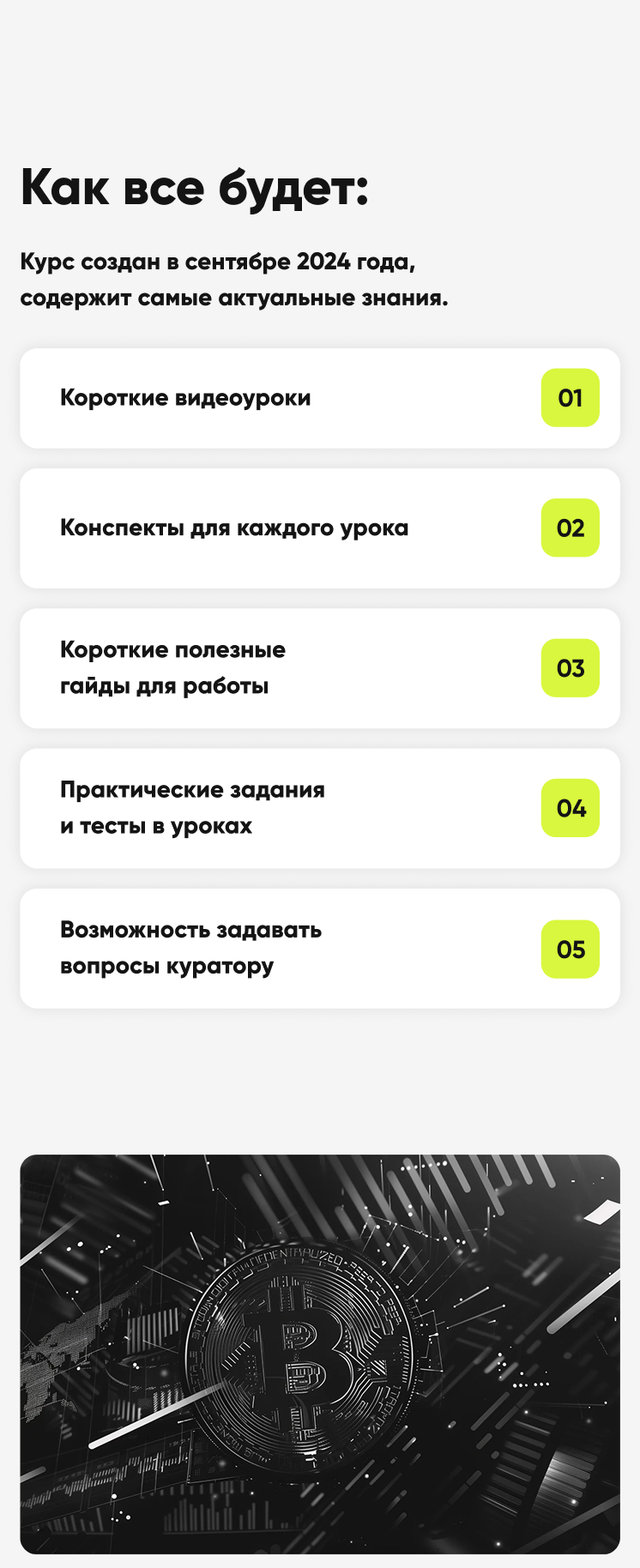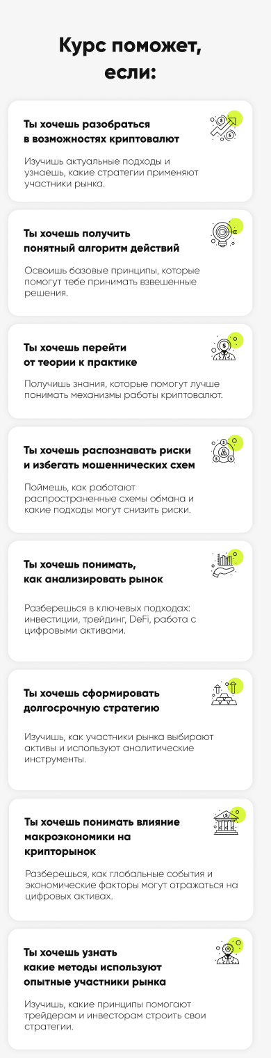- Обучает анализу и пониманию крипторынка.